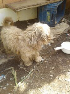Esse é o Jhonny. Resgatado de uma condição precária, onde ficava amarrado dia e noite, sob sol e chuva, sendo protegido apenas por uma tampa de caixa d’água, e a cama um caixote de feira.